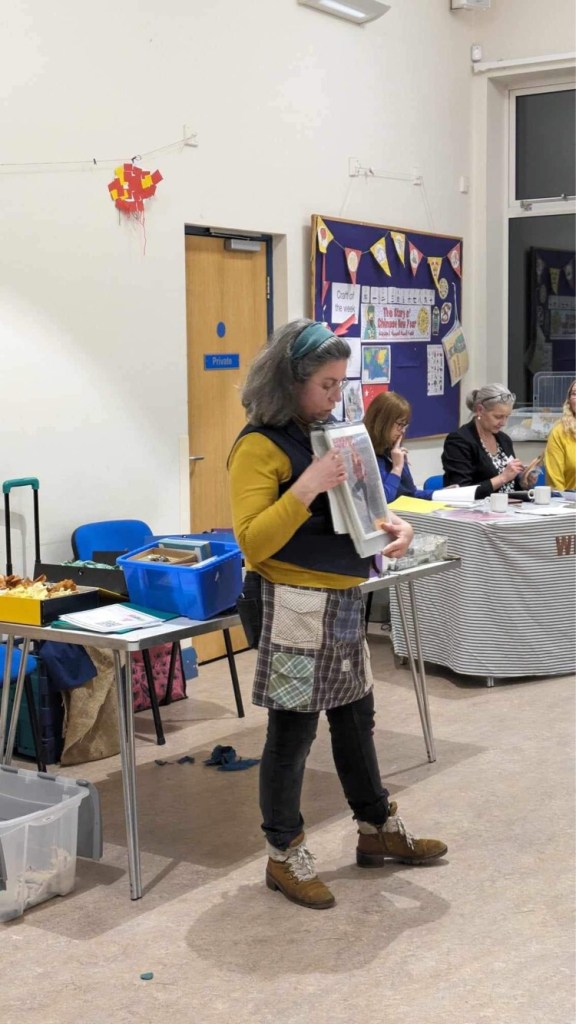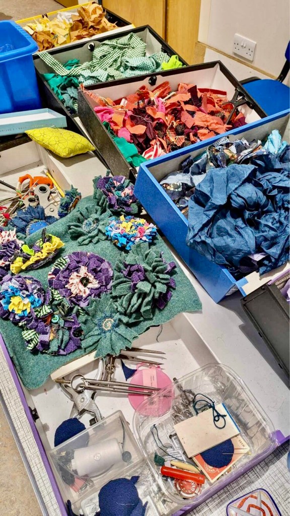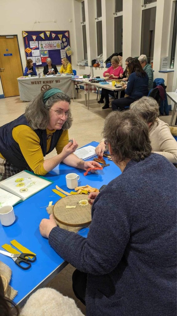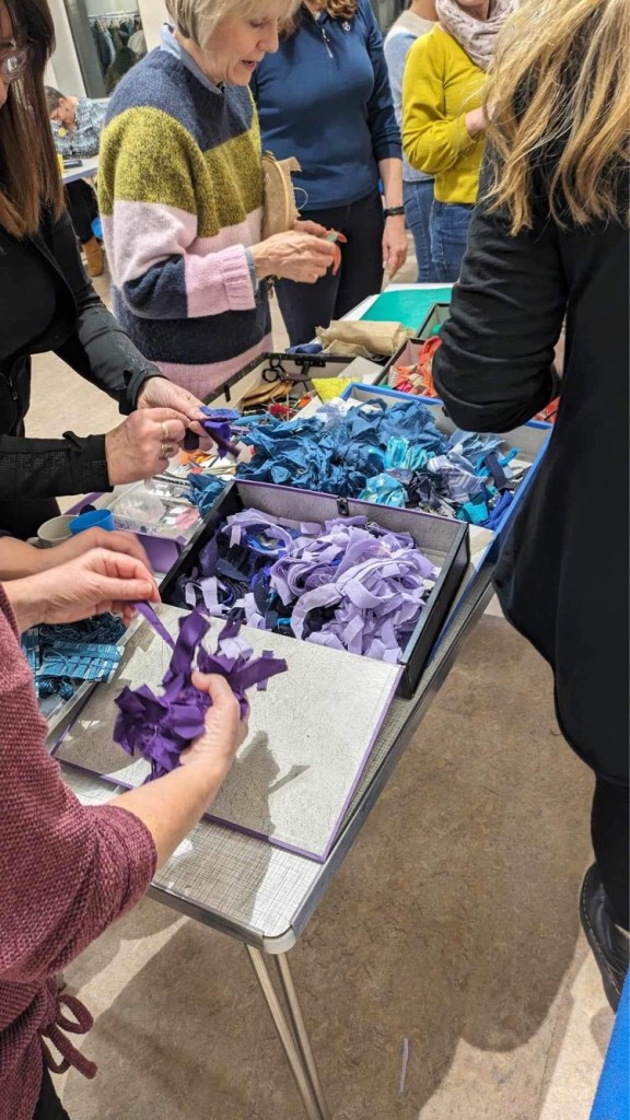 On Thursday evening, West Kirby’s Women’s institute meeting got creative with creatively recycling old clothes. I developed a new workshop to create a brooch using the proddy or proggy rag rugging technique in a short space of time by creating a fabric flange or doughnut shape which had three roles – helping to contain the tufted creations, hemming the hessian and giving a consistent edge that allowed the fluffy creations to be attached to the hand crafted back made from a vinyl banner. Lots of prep time to cut and sort fabric, develop the logistics but the costs to create each piece were minimal – 2 brads or split pins and safety pins.