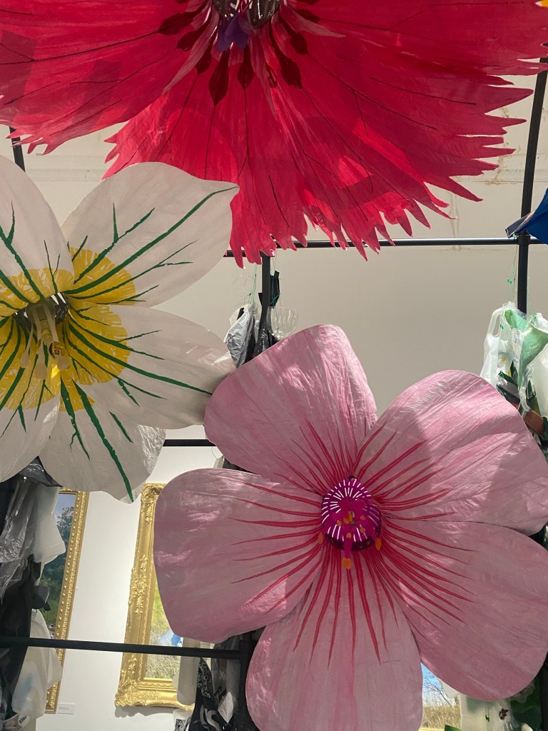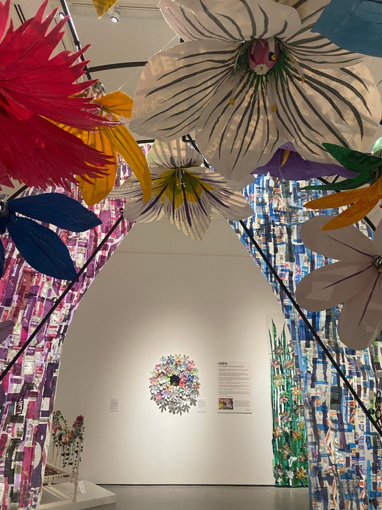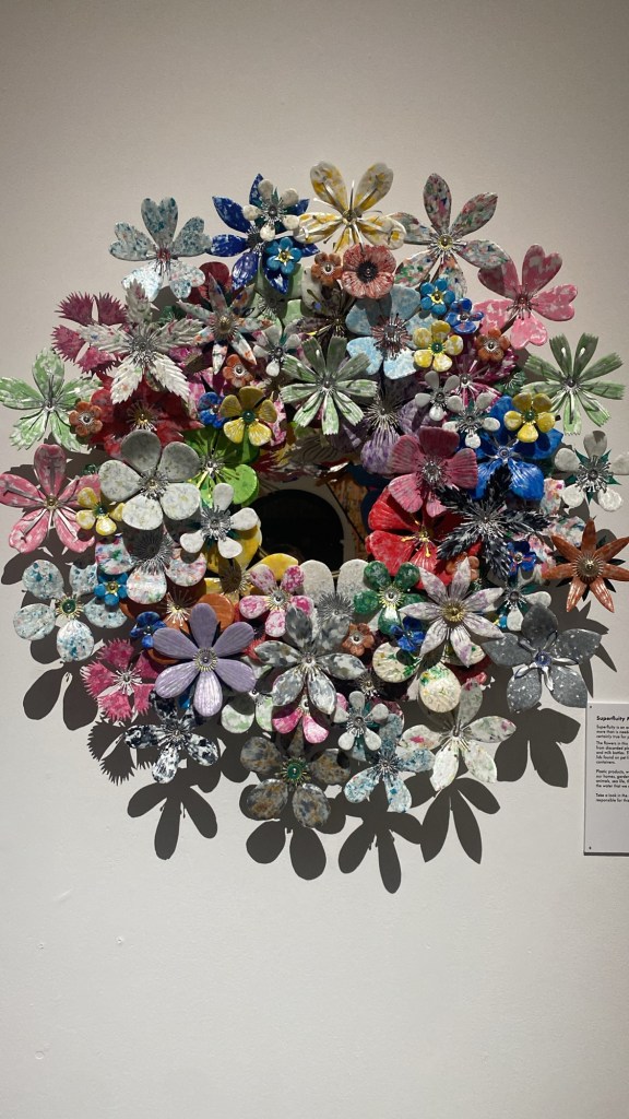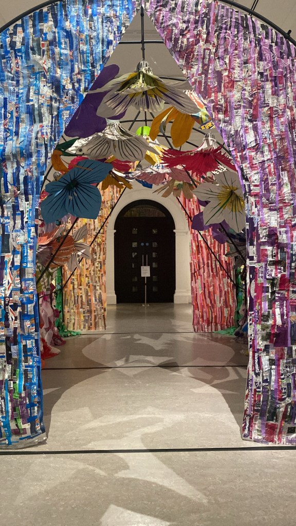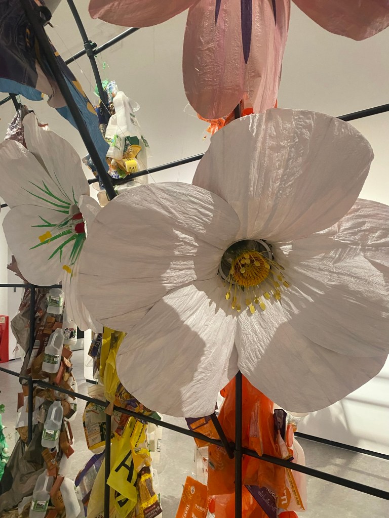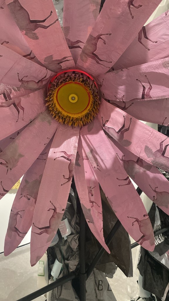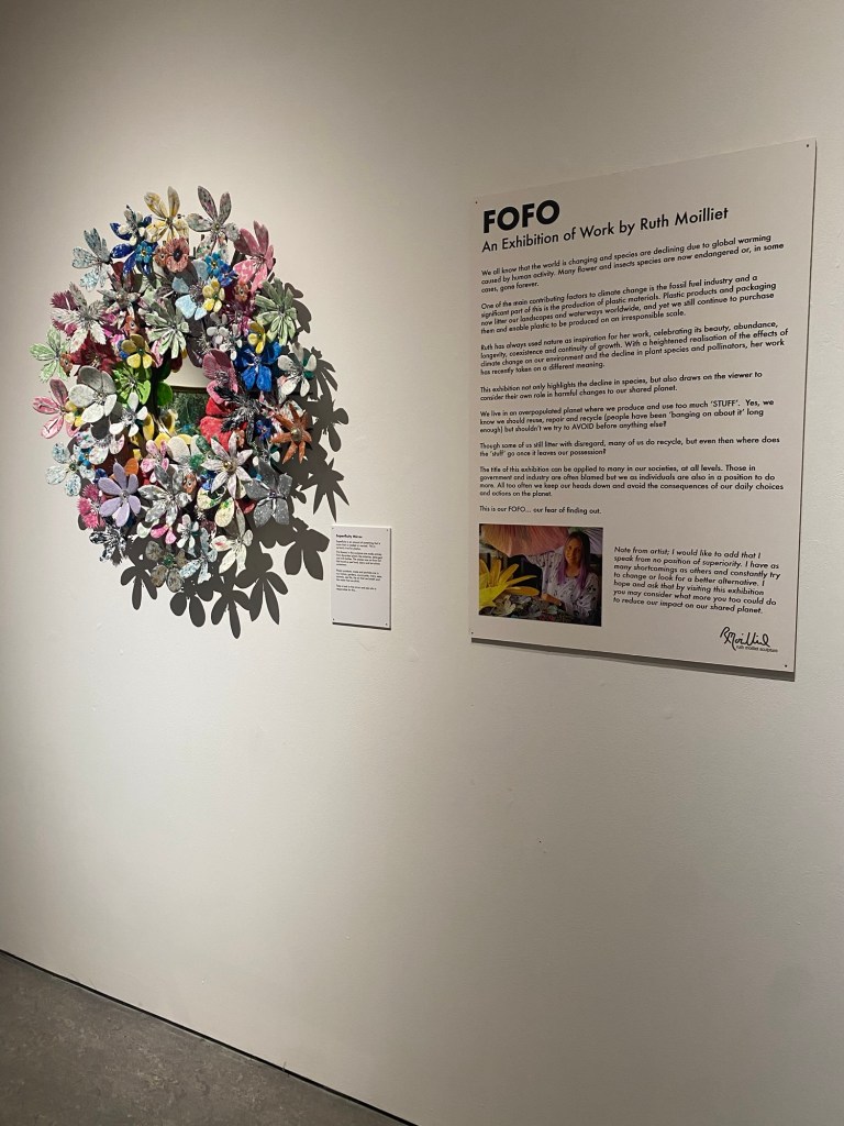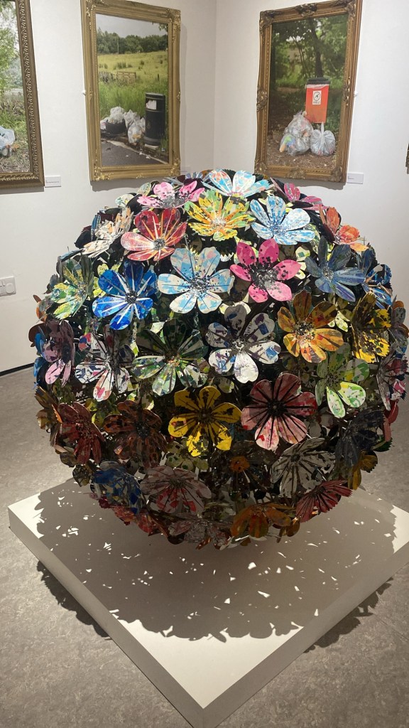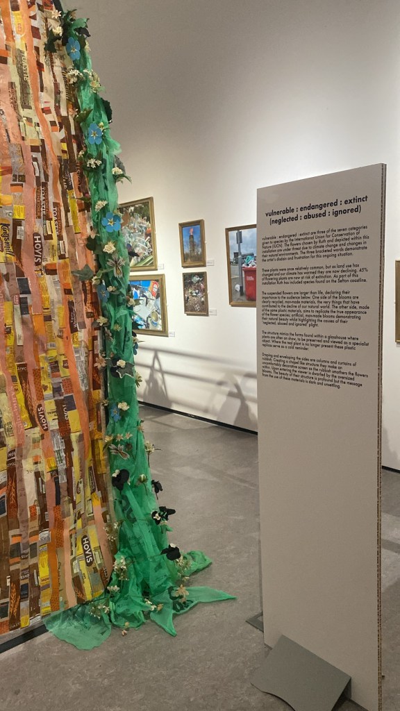 I went to visit yesterday Moillet’s exhibition yesterday and scope out our space. I knew her work from exhibiting at the first Liverpool Design Show many many years ago and from Crafts magazines. At the time single colour of metal and fairly regimented and large in scale – very dramatic. Now colour and diversity of materials have become evident and really contact with the community, climate change and looking at her surroundings. Some similarity to the nine giant flowers I did in 2022 for Wirral Environmental Network and to Ling Warlow’s giant natural dyed paper flowers. Here are her pieces and I think our exhibition Floribunda will complement hers very well.