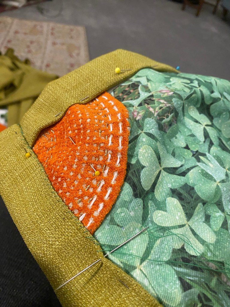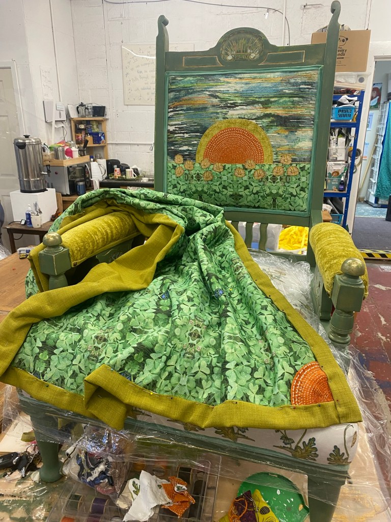 The backing linen fabric and orange fabric were each salvaged. The half circle of radiant sun in two of the edges echoes the design created by Karen on the chair back and back of back is made from a blind sample. The gold thread was also from stash of salvaged bits and bobs and the embroidery thread, used in the detailing of many of the blue parts of the design was rescued recently and may ultimately have been donated as part of outreach for Charles Metcalf’s award winning exhibition reminiscing about Lees Tapestries. Look them up if you are not from Birkenhead, they made amazing fabrics for Cunard and another of the great SMEs from the area ( Star Yachts and Della Robbia being the other two).