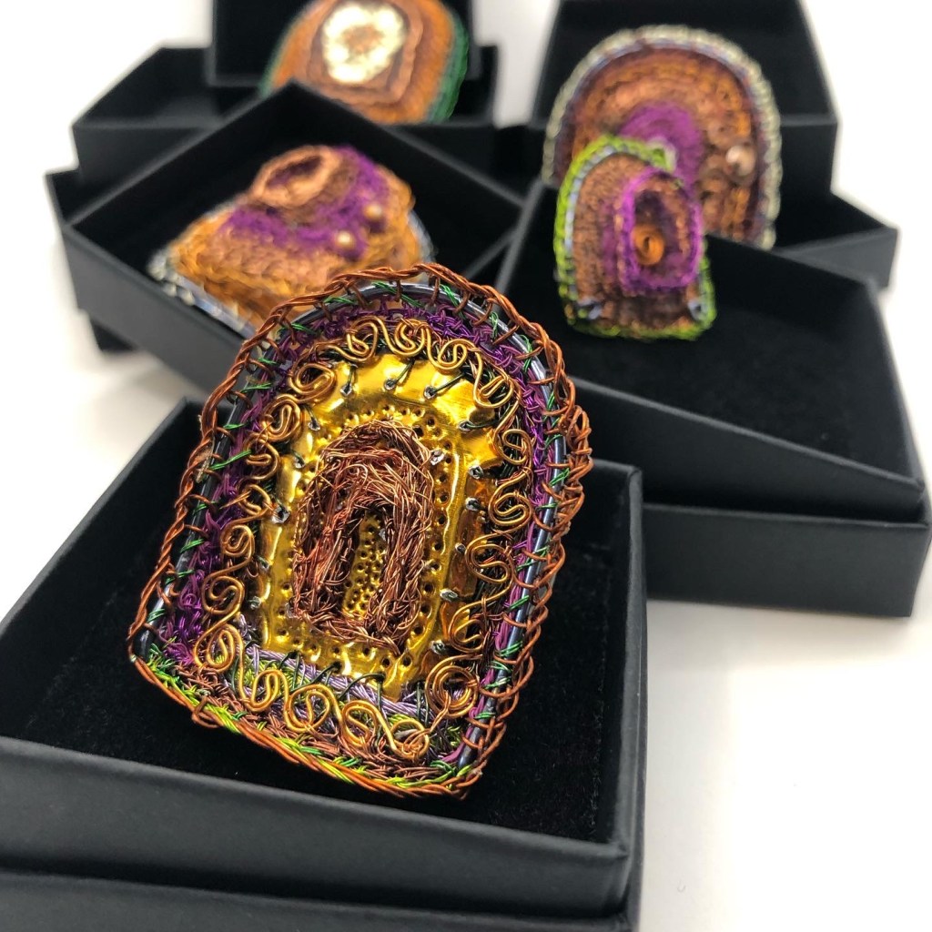Alison’s staple ingredient in her work is wire that she reclaims from old televisions, the older the better. She has found over a hundred different colours and hues of copper and aluminium wire. Lately though, due to the rate of development in technology, she is finding it harder to find the old television sets and has had to resort to buying various colours of wire. There is always a high component of re-used materials in her work – whether it is re-using charity shop finds or sweetie wrappers to get the right colour. She has become increasingly aware of how wasteful our society is becoming.